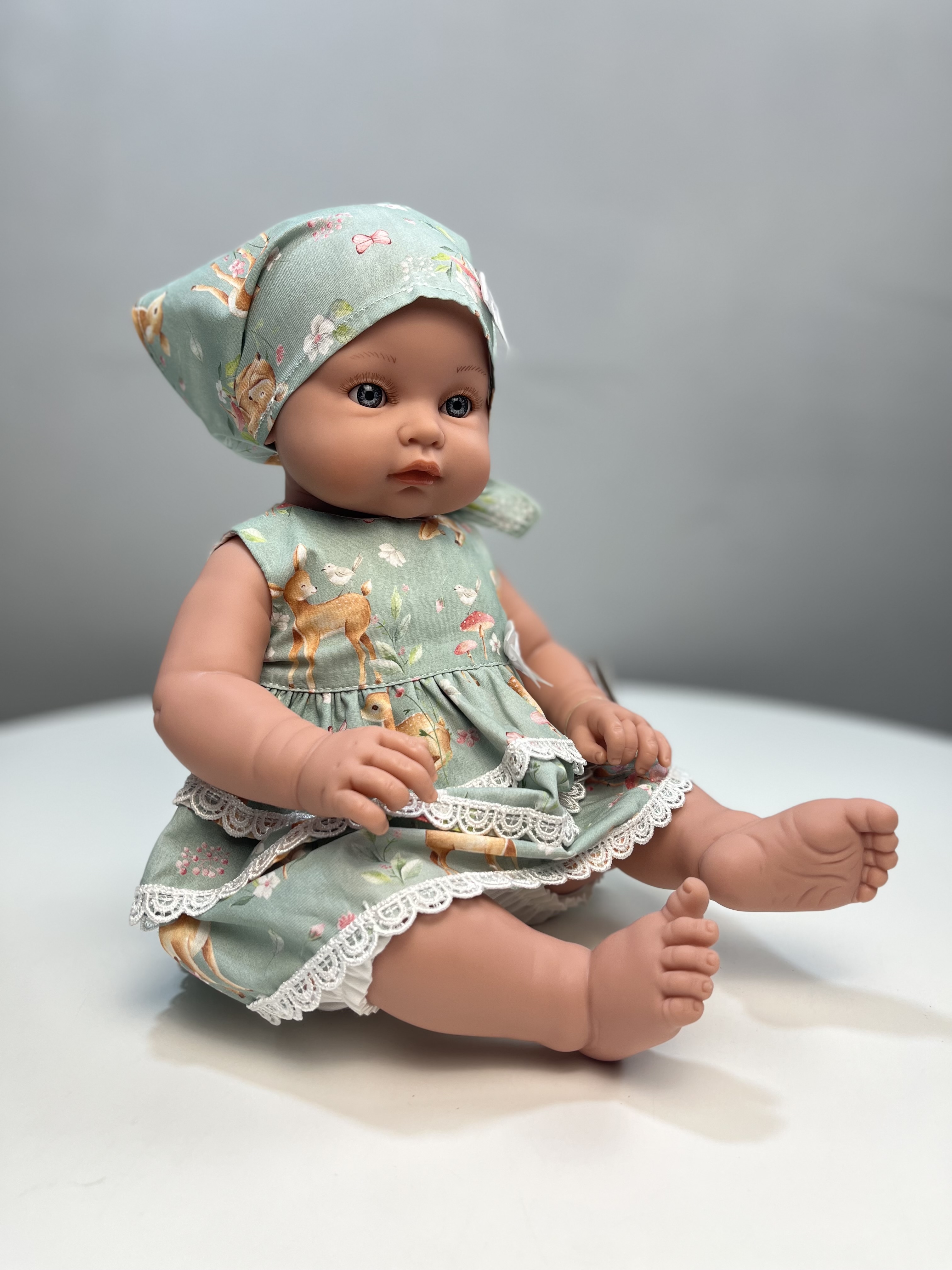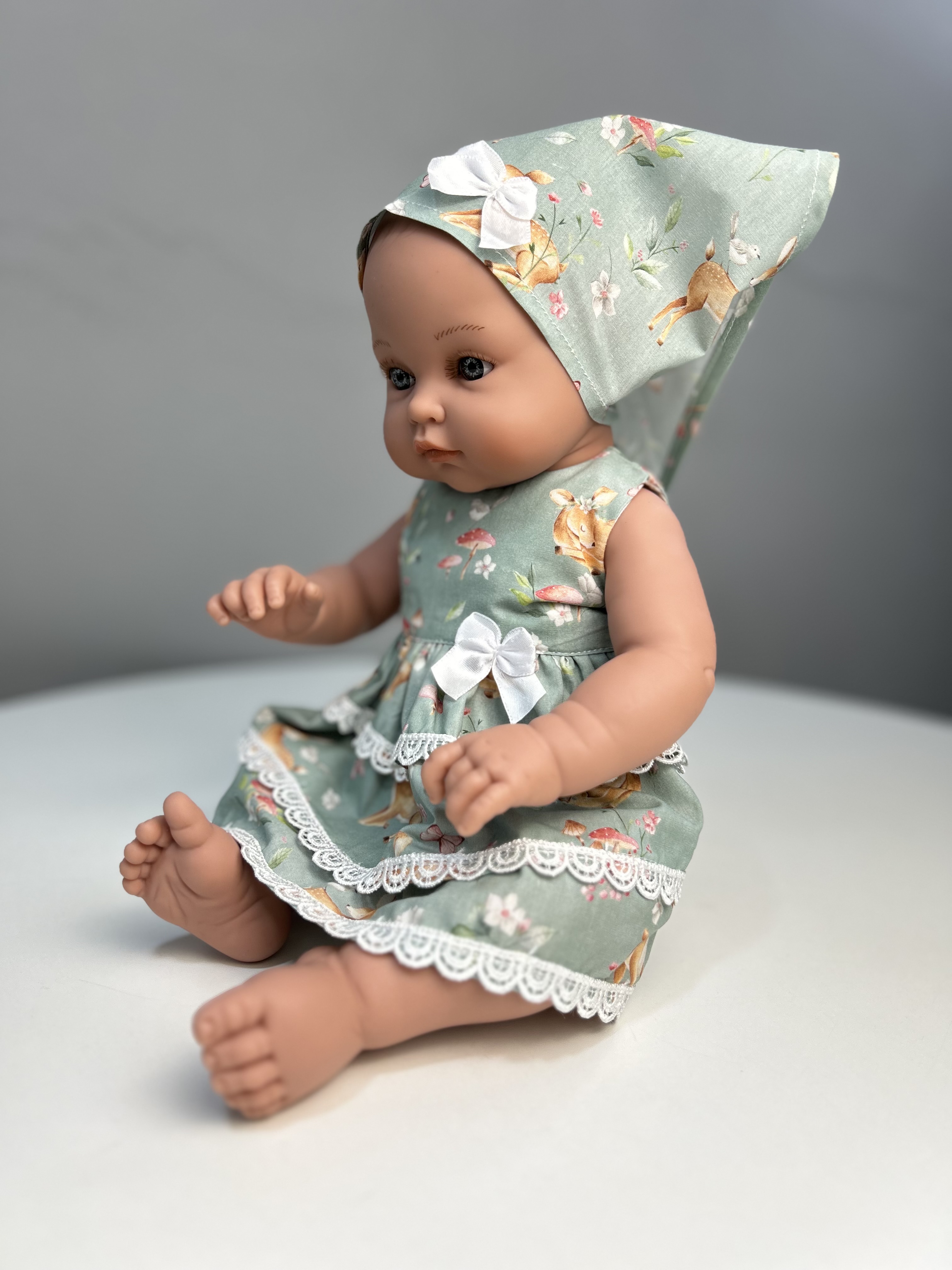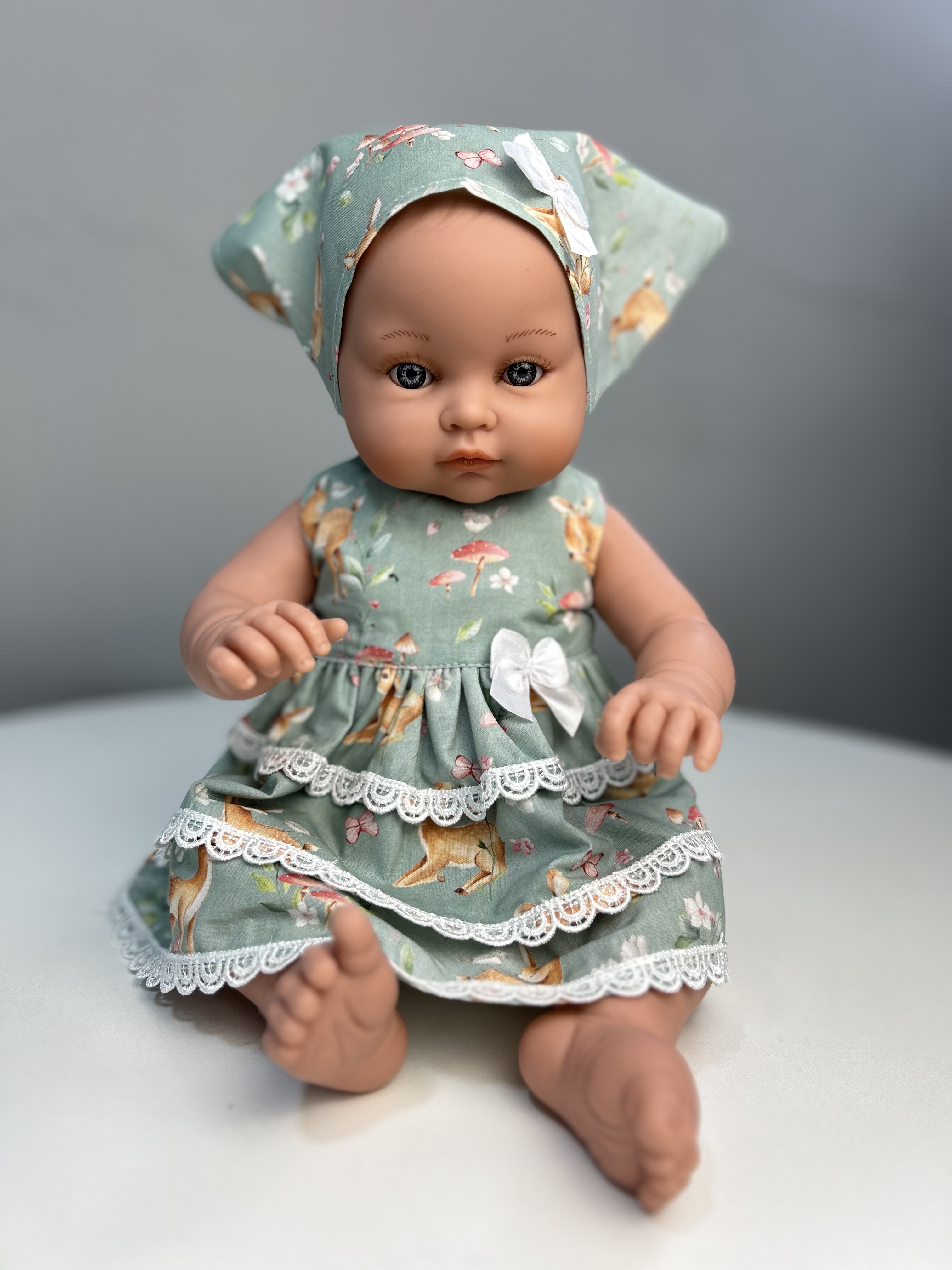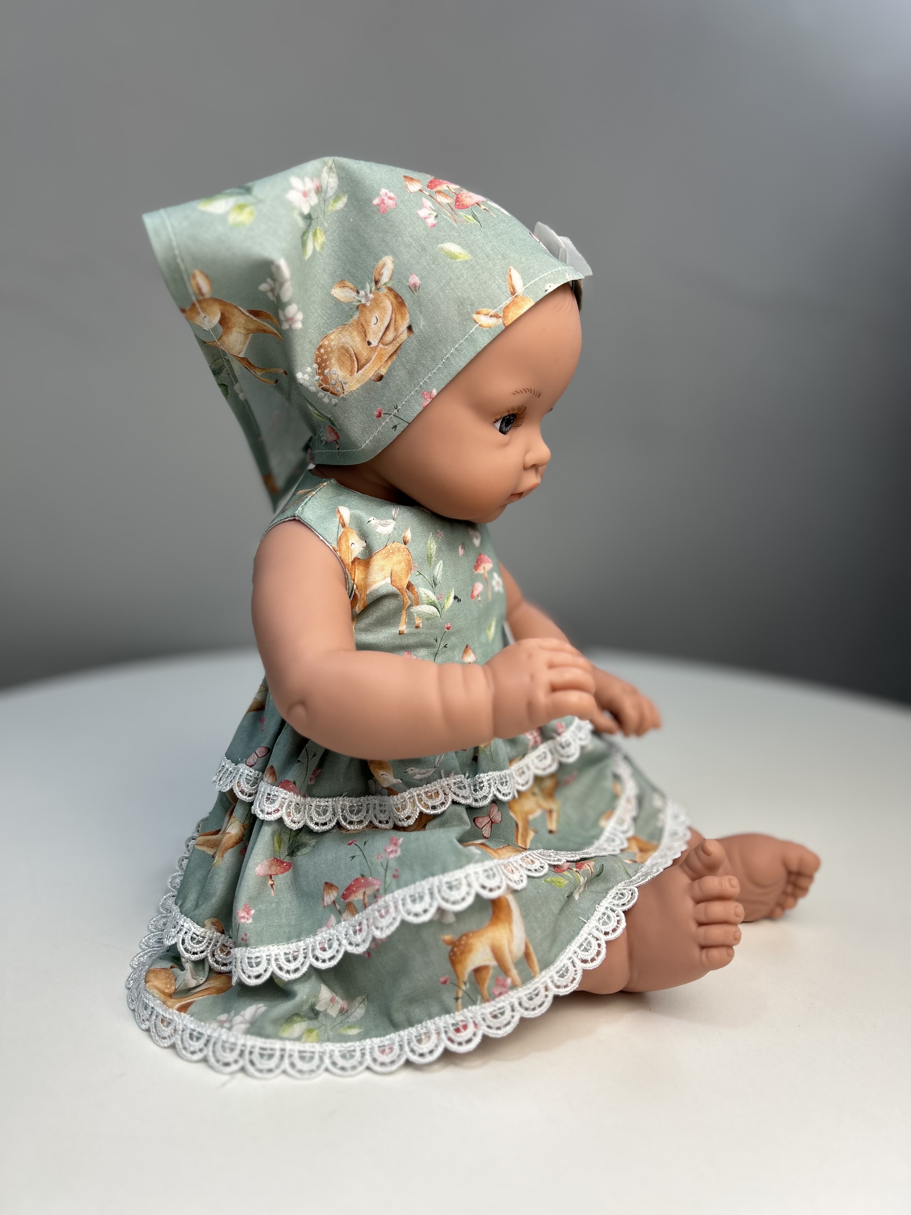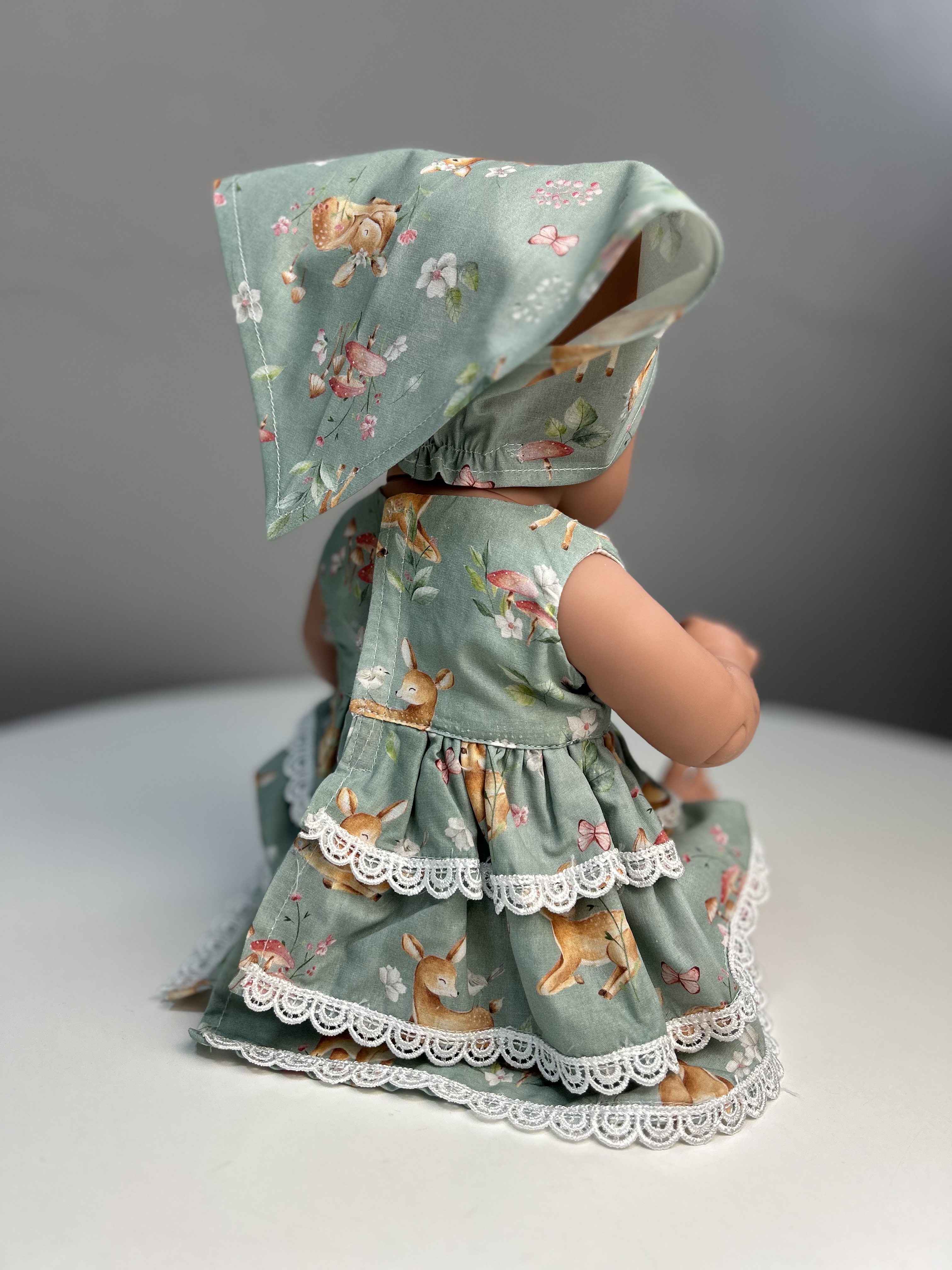 Талантливые дизайнеры TuKiTu с заботой придумали для куклы чудесный комплект одежды: платье "Оленята" с воланами, украшенное кружевом, а на голове очаровательная косынка.